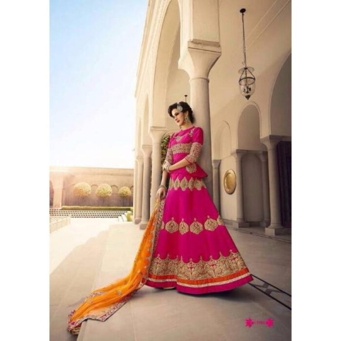 Designer party wear bhagalpuri silk bridal lehenga. Heavy work with zari, stones have work on blouse and bottom. net dupatta have work on four sides zari, moti work on border lines.